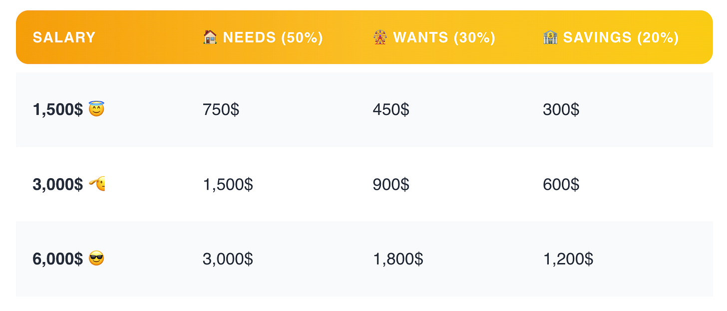 🏦 20% Savings: paying off debt, investing, etc.